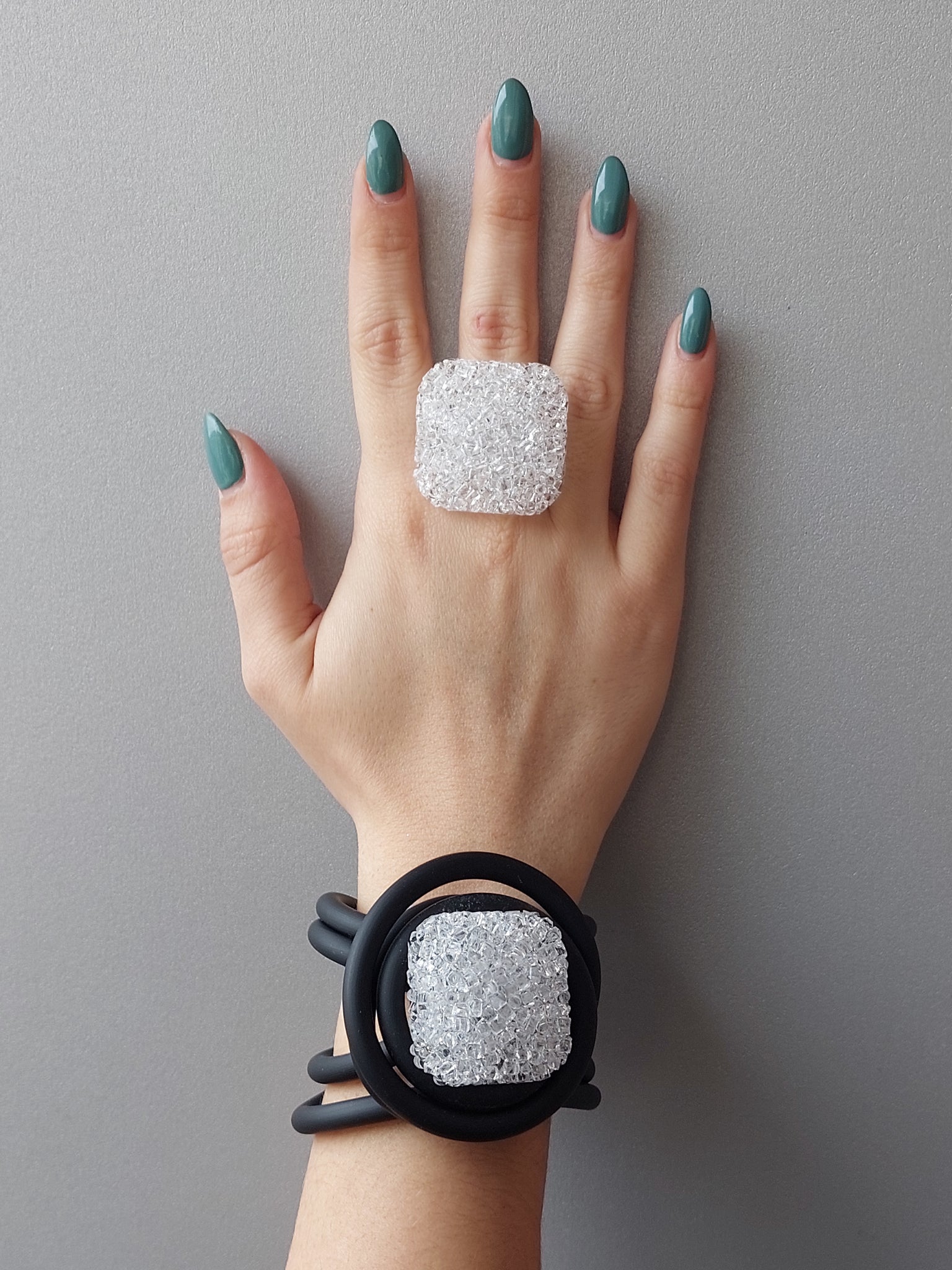 anelli in poliestere montati su pvc anellergico,anello e bracciale regolabili