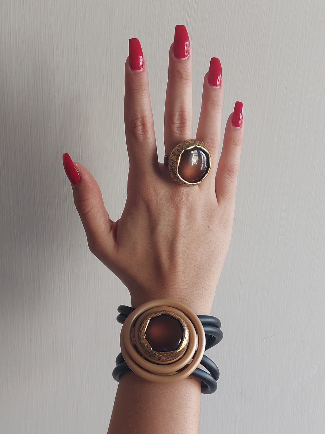 Bottoni in orrone d'orario con interno in ceramica lucida montati su tubo in pvc ,anello e bracciale regolabili